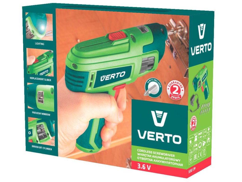 Akumulátorový šroubovák VERTO je vybaven účinnou Li-Ion baterií s napětím 3,6 V a kapacitou 1,5 Ah. Maximální točivý moment 3 Nm a otáčky až 230rpm jim umožňuje rychlé šroubování a soustružení. Náhradní posuvník umožňuje rychlou výměnu bitů obsažených uvnitř šroubováku. Okno navíc umožňuje náhled na použitý bit. Šroubování v těsných a tmavých prostorech je snazší díky svítilně. Tělo šroubováku je vyrobeno z vysoce kvalitního plastu odolného proti poškození. Měkké podložky integrované do rukojeti zvyšují pohodlí při práci. Lehký šroubovák 0,4 s ergonomickým tvarem je ideální pro použití v náročných podmínkách. Sada šroubováků obsahuje: nabíječku a úložný prostor s 10 bity šroubováku. Shoda s evropskými bezpečnostními normami je potvrzena certifikátem CE. Značka VERTO nabízí sortiment elektrického nářadí a příslušenství pro všechny kutily.