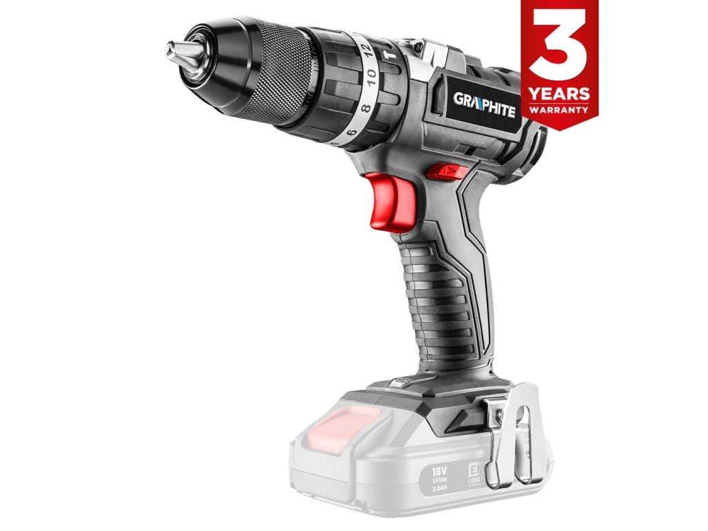 Příklepová akumulátorová vrtačka 18V GRAPHITE kompatibilní s akumulátory GRAPHITE ENERGY plus. AKU vrtačka s plynulou regulací otáček a přepínáním směru otáčení. Upnutí nástrojů pomocí vrtací kleštině. Zařízení je vybaveno elektromotorickou brzdou a automatickým blokováním vřetena. Součásti AKU vrtačky je i LED dioda pro osvětlení pracovní plochy. Ergonomická rukojeť potažená protiskluzovým materiálem pro práci v obtížných podmínkách. Planetové ozubení vyrobeno z vysoce kvalitní oceli.