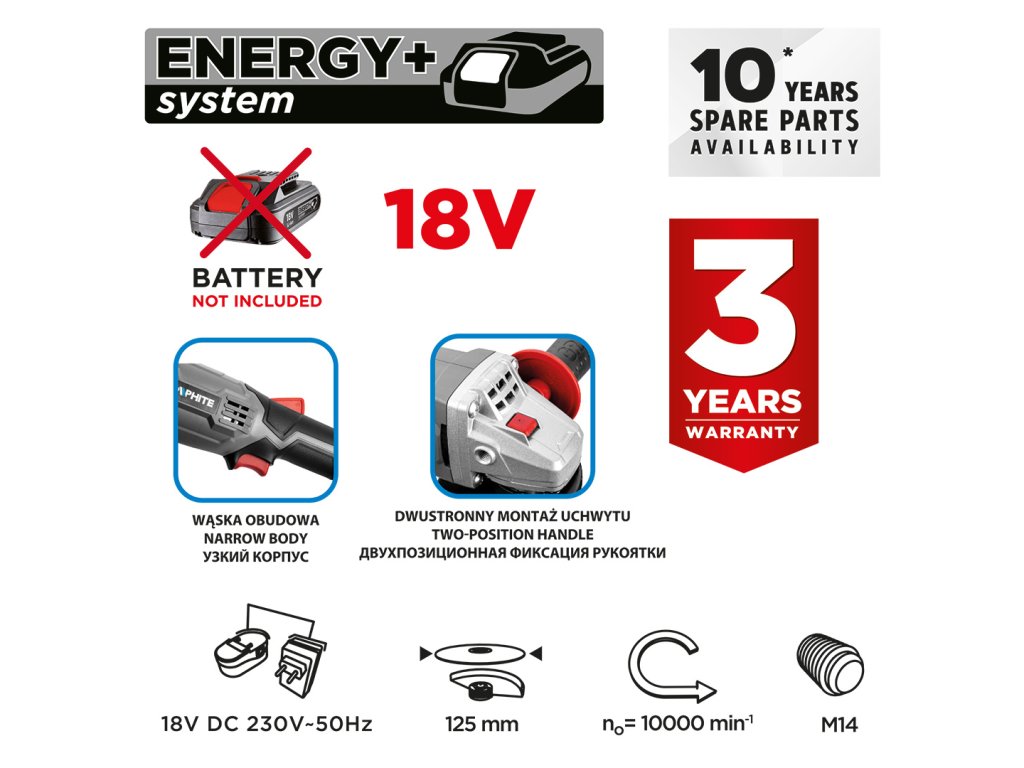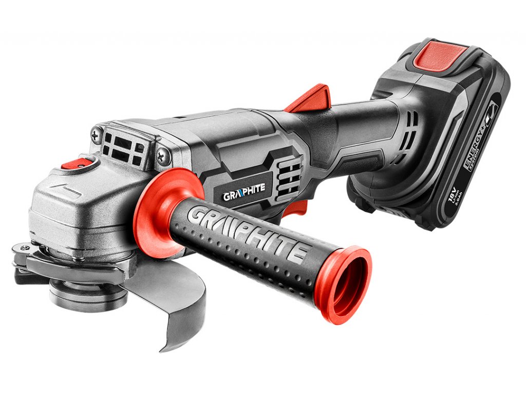 Akumulátorová úhlová bruska 125 mm Energy+ 18V 58GE130 od společnosti GRAPHITE je akumulátorový stroj poháněný systémem Energy+. Je kompatibilní s 18V lithium-iontovými akumulátory. Doporučená kapacita akumulátoru je 4 Ah. Vyznačuje se dosažením 10 000 otáček za minutu a závitem vřetena M14. Je vybavena kotoučem o průměru 125 mm a umožňuje pohodlné řezání různých materiálů. Dvoupolohová boční rukojeť a aretace vřetena usnadňují a urychlují plánování. Tento model brusky je rovněž vybaven bezklíčovou sestavou ochranného krytu. Díky ergonomickému tvaru je práce s ní pohodlnější.