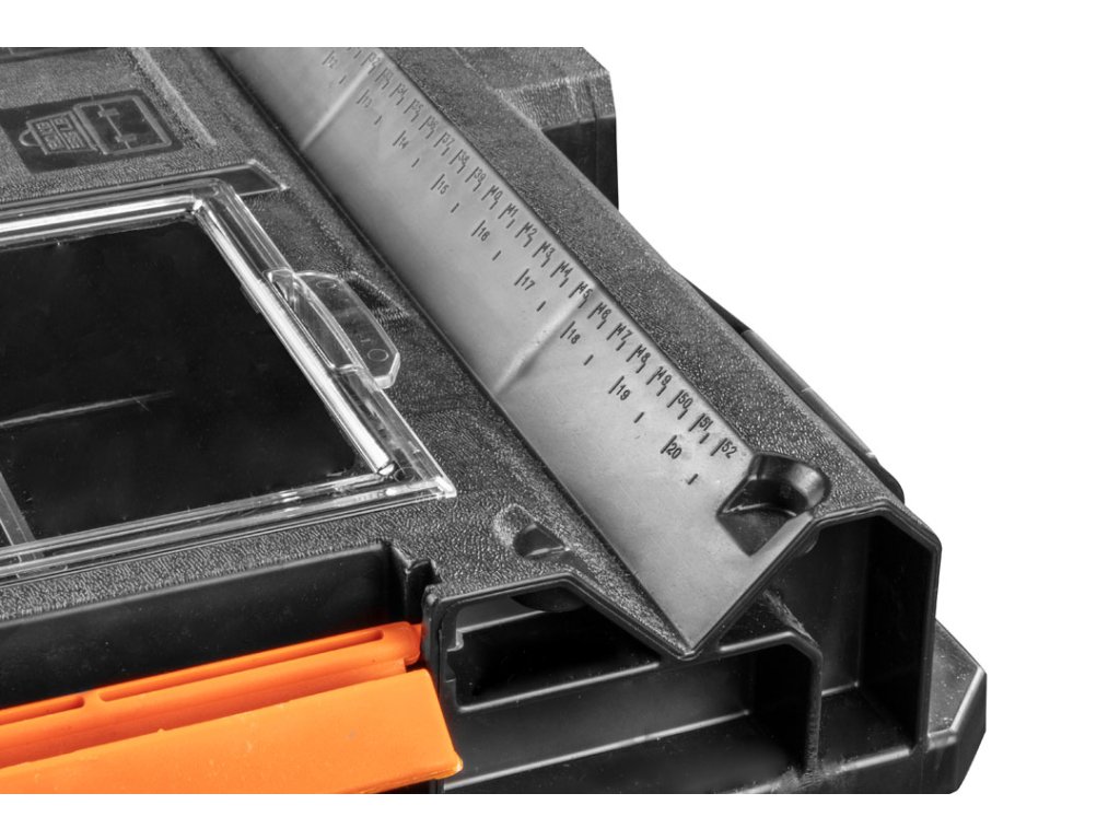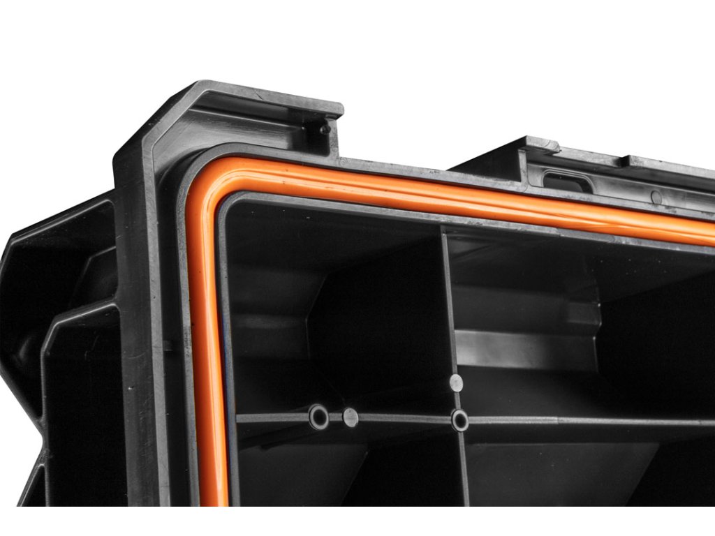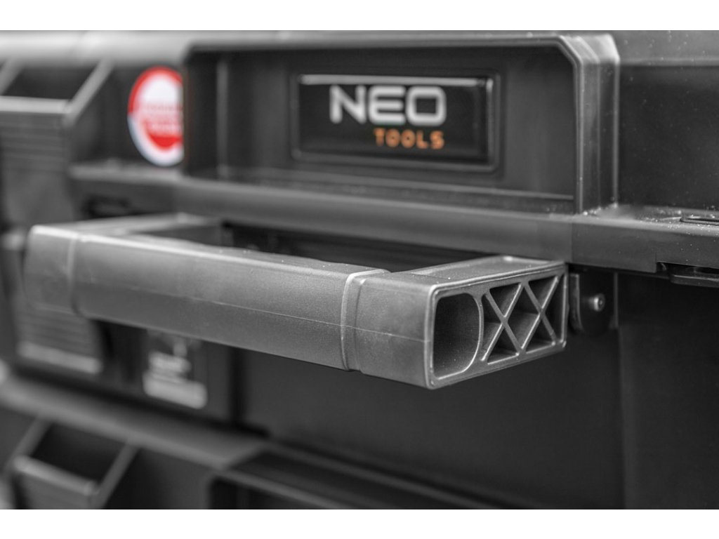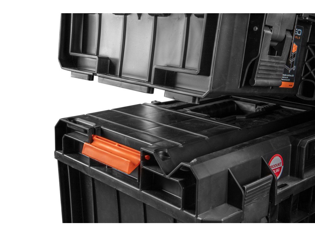 Modulární box 350 NEO (ref. 84-256) je robustní pouzdro pro přenášení a skladování stavebního nářadí. Těsnění ve víku účinně chrání nářadí před prachem a vlhkostí. Silná struktura umožňuje, aby se na něj postavil člověk do 120 kg. Vysoká kapacita vám umožní přenášet i ty největší nástroje a elektrické nářadí. Vnitřní oddíly zvyšují užitečnost krabice. Silná rukojeť vám umožní nést až 50 kg nářadí.Doplňkové parametry