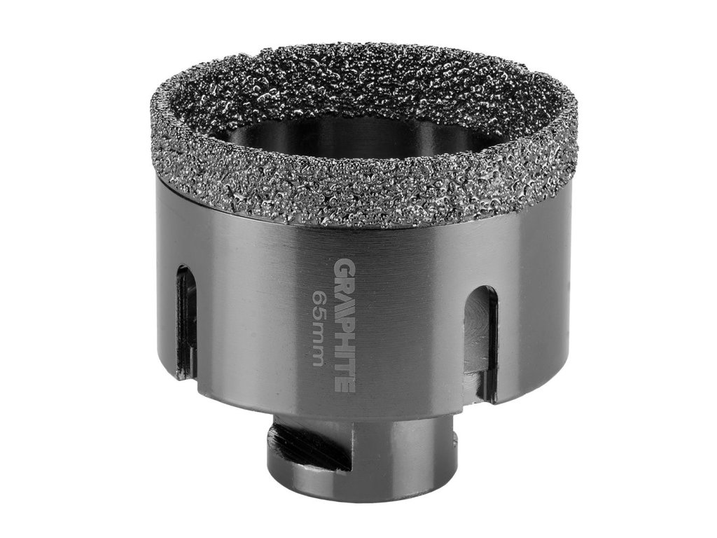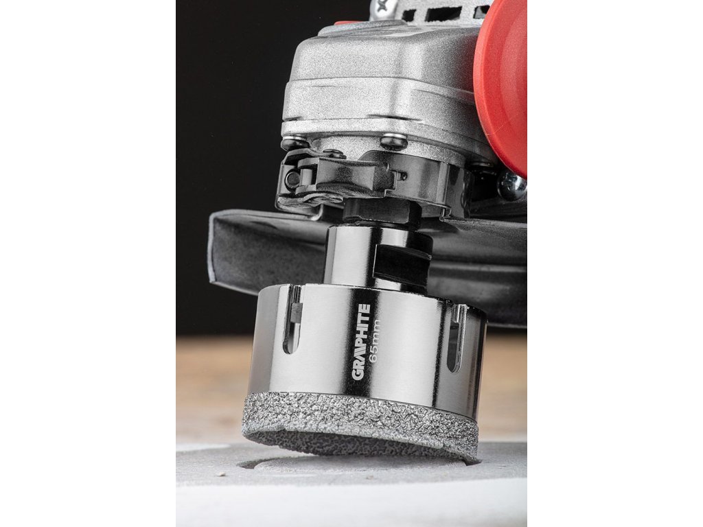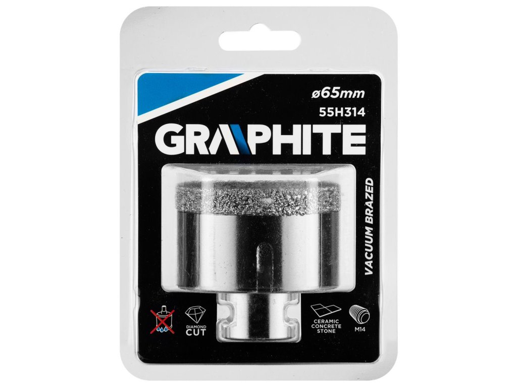 Diamantová fréza GRAPHITE (ref. 55H314) o průměru 65 mm se závitem M14 je určena pro přesné řezání kamene, kameniny, dlaždic, skla, asfaltu, cihel, betonu. Díky použití diamantu je řezná síla soustředěna na malé ploše, což eliminuje riziko prasknutí nebo poškození povrchu. Vhodné pro chod na sucho.
