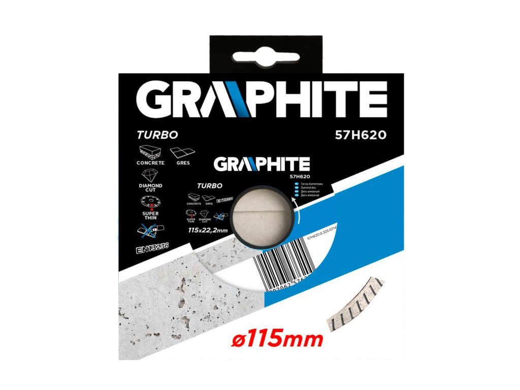 Diamantový kotouč turbo GRAPHITE je díky segmentům typu TURBO lisovaným za horka vhodný k vykonávání těžkých stavebních prací. Kotouč díky své zredukované tloušťce umožňuje dvakrát rychlejší řezání. Vysoce odolné diamantové segmenty umožňují účinné řezání prvků z betonu, železobetonu, žuly, mramoru, kamene, cihly, atd.