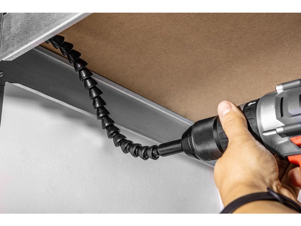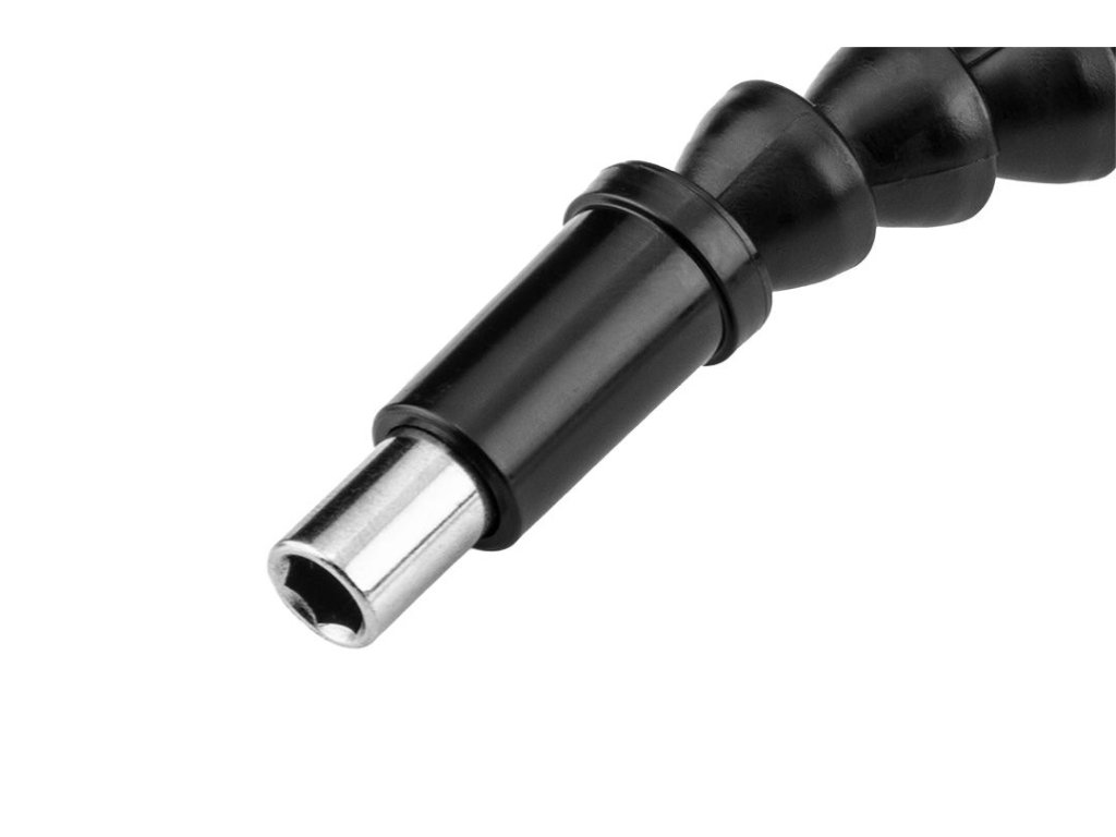 Flexibilní držák bitů 290 mm 55H227 GRAPHITE je magnetický držák určený pro vrtačky nebo šroubováky, který umožňuje práci v úzkých a těžko dostupných místech. S jeho pomocí můžete pohodlně utáhnout šroub v libovolném úhlu a blízko okraje, čímž si značně usnadníte práci.