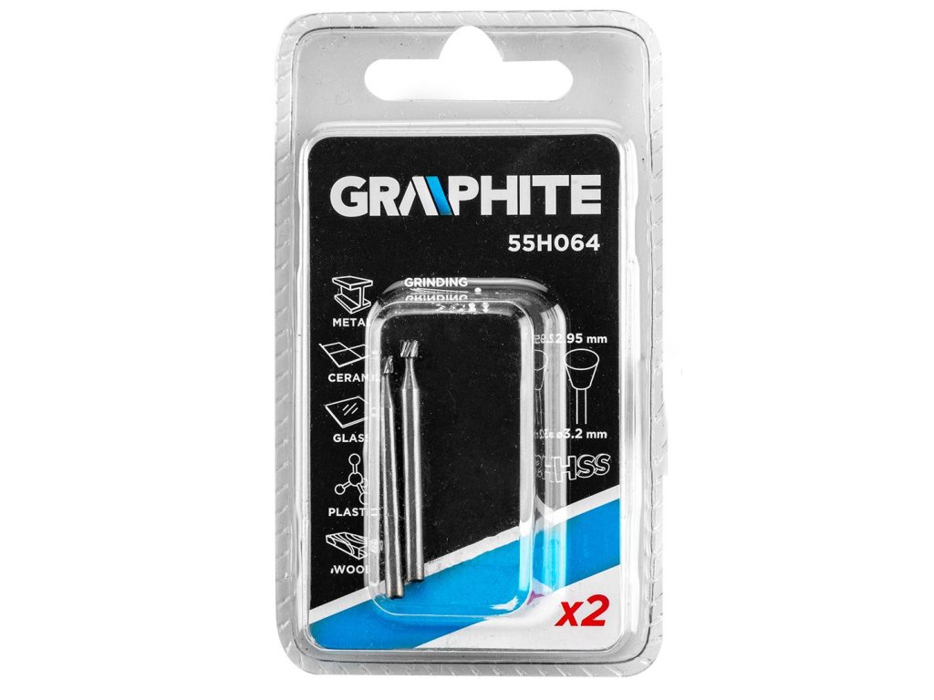 HSS fréza GRAPHITE (ref. 55H064) ve tvaru trapézová o průměru 2,95 mm. Sada obsahuje 2 ks. Jsou určeny pro použití s mini bruskou. Vhodné pro tvarování, vyhlubování, drážkování, sekání, závitové otvory v různých materiálech. Lze je použít na kovy, plasty, sklolaminát a dřevo.