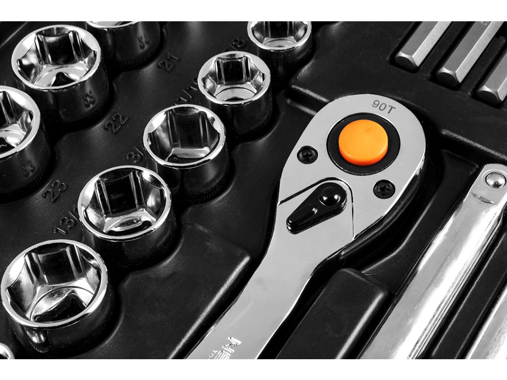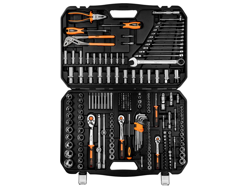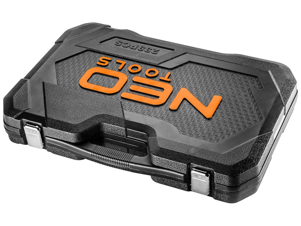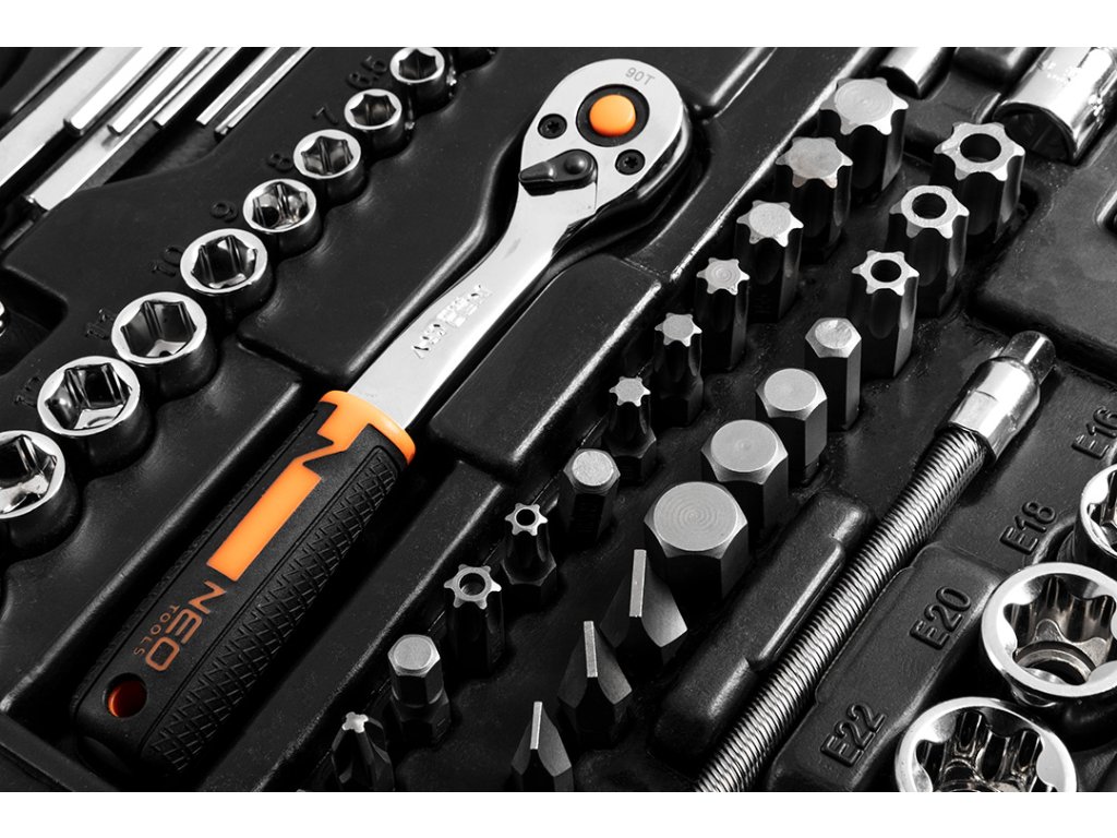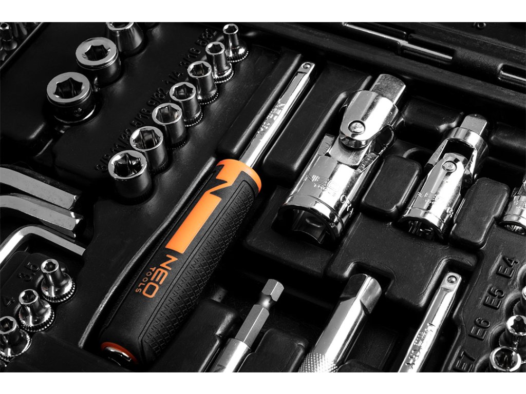Nástrčné klíče NEO (ref. 10-078) jsou největší sadou v nabídce. Obsahuje až 233 prvků ve velikostech 1/2", 3/8" a 1/4" vyrobených z vysoce kvalitní chrom-vanadové oceli. Klíče se dodávají v praktickém a robustním plastovém pouzdře s kovovými sponami a praktickou rukojetí. Uvnitř kufru najdete kompletní balík nářadí: šestihranné nástrčné hlavice (krátké a dlouhé), E-nástrčné hlavice, šroubovací bity (v různých konfiguracích včetně prodloužených pro šrouby umístěné v hlubokých zásuvkách), šestihranné klíče (dodáváno v praktické rukojeti), klíče s otevřeným koncem (všechny nejoblíbenější velikosti 8 do 22 mm), adaptéry pro šroubováky (díky kterým lze nakonfigurovat prvky pro konkrétní elektrické nářadí), 4 zásuvky pro zapalovací svíčky (možnost okamžité konstrukce z dostupných prvků, klíč na zapalovací svíčky dokonale odpovídající konkrétnímu typu motoru), příslušenství. , které jsou v soupravě k dispozici, jsou v metrickém a palcovém provedení, což prakticky vylučuje možnost, že by se nářadí nehodilo např. na šroub. Tuto rozsáhlou sadu doplňují šroubováky, víceúčelové kleště a kleště na trouby, které vám umožní pracovat v situacích, které vyžadují nestandardní řešení. Račny s ohnutými rukojeťmi (3 ks) mají 90 zubů, díky čemuž lze pracovat v místech s omezeným prostorem (ráčna vyskočí při otočení o 5 stupňů). Sada pro všechny uživatele, kteří chtějí mít co nejširší balíček nástrojů. Kvalitu a spolehlivost nářadí potvrzuje 25letá záruka a mezinárodní certifikát TÜV. Značka NEO splňuje očekávání profesionálů.