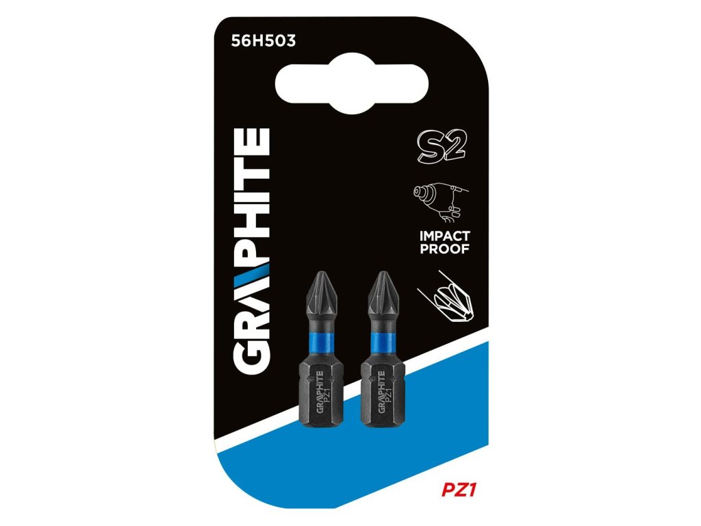 Nárazové bity GRAPHITE (ref. 56H503) typu PZ1, o celkové délce 25 mm, jsou těžké bity určené pro těžší práci s vysokými momenty pomocí šroubováků nebo rázových utahováků. Vyrobeno z vysoce kvalitní oceli S2, která se vyznačuje zvýšenou flexibilitou a odolností proti mechanickému poškození. Torzní zóna, rotující pod vlivem vysokého točivého momentu, snižuje přenos síly, čímž je bit odolnější proti zlomení, a jeho životnost se několikrát prodlouží. Pracovní špička špičky zaručuje dokonalé uchycení. Značka GRAPHITE nabízí širokou škálu elektrického nářadí, které splňuje požadavky profesionálů.