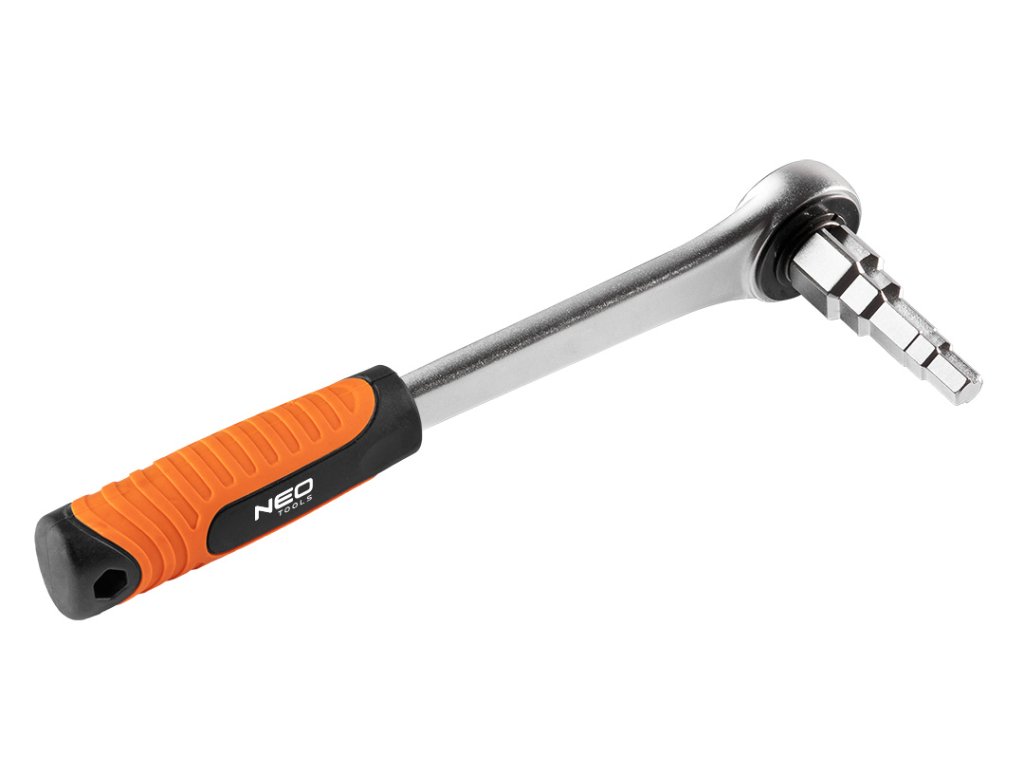 Šroubovací klíč 1/2" NEO (č. 02-060) vybavený ráčnou a krokovým klíčem pro velikosti 3/8", 12 mm, 1/2", 16,8 mm a 22 mm. Vhodné pro montáž a demontáž armatur s vnějším závitem, šroubových spojů apod. Vyrobeno z vysoce kvalitní chrom-vanadiové oceli pro dlouhou životnost klíče. Ergonomická plastová rukojeť ze dvou materiálů zvyšuje pohodlí při práci a zabraňuje vyklouznutí klíče z ruky. Spolehlivost výrobku potvrzuje záruka 25 let. Značka NEO splňuje očekávání profesionálů.