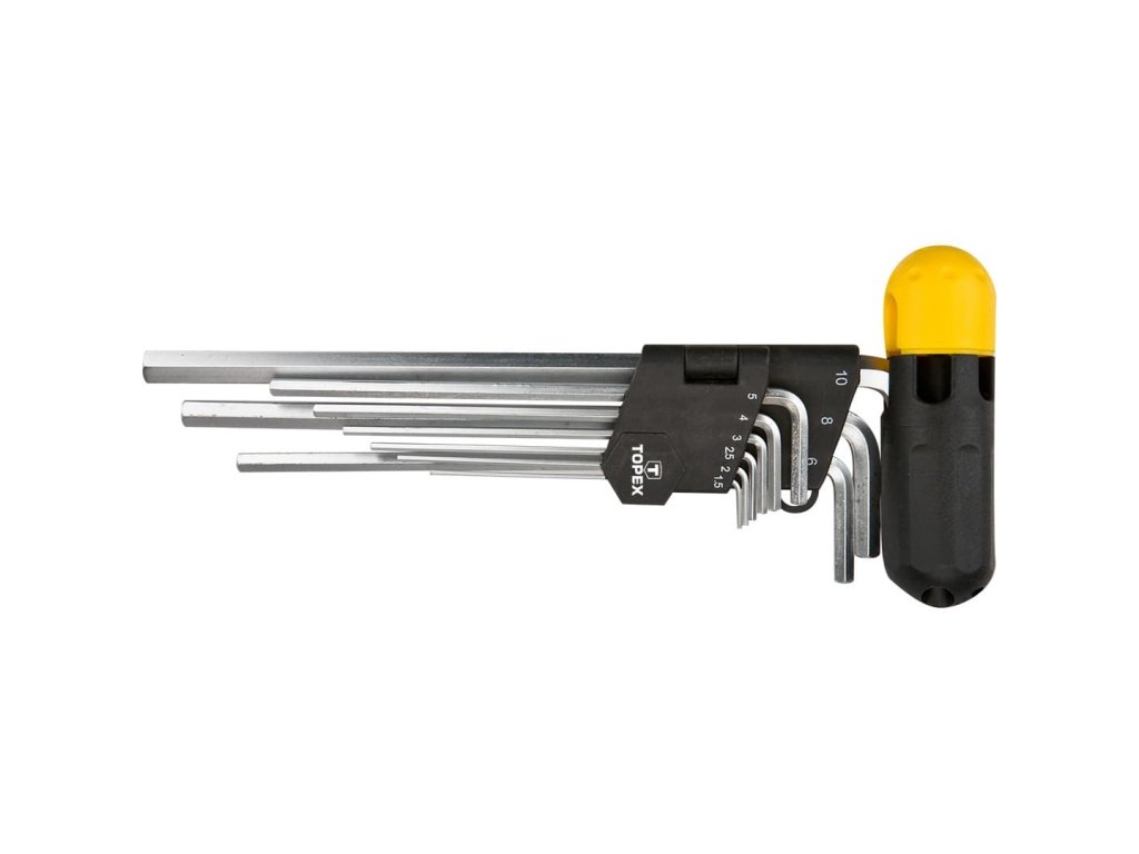 Sada 9-ti šestihranných imbusových klíčů Topex vyrobených z odolné chrom vanadové oceli. Další skvělou výbavou je rukojeť (plast). Rukojeť slouží k pohodlnějšímu uchopení klíče. Praktické plastové obaly s vyznačenou přihrádkou pro každý klíč zvlášť. Usnadňují jejich skladování. Značka TOPEX je zaměřena pro kutily a méně náročné profesionály.