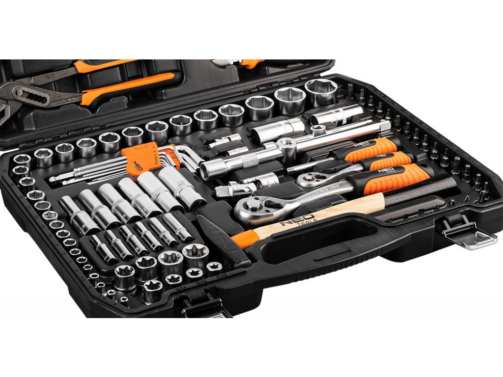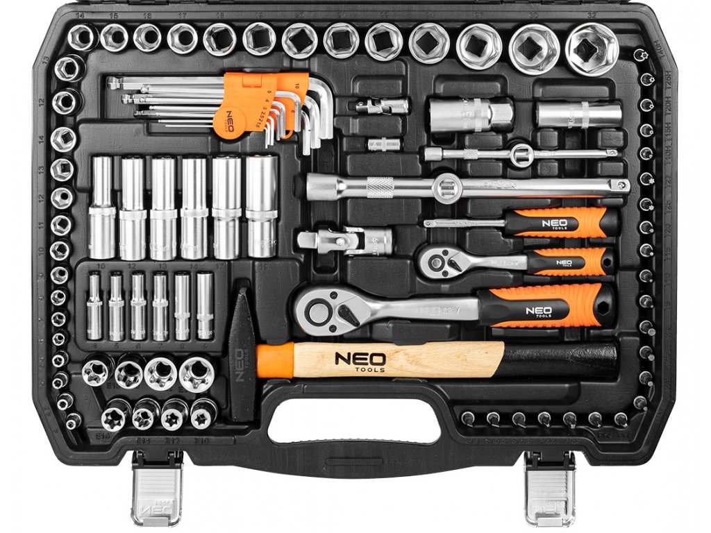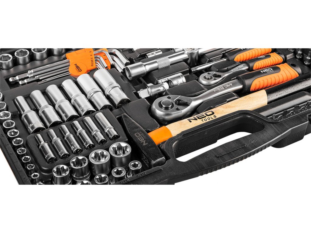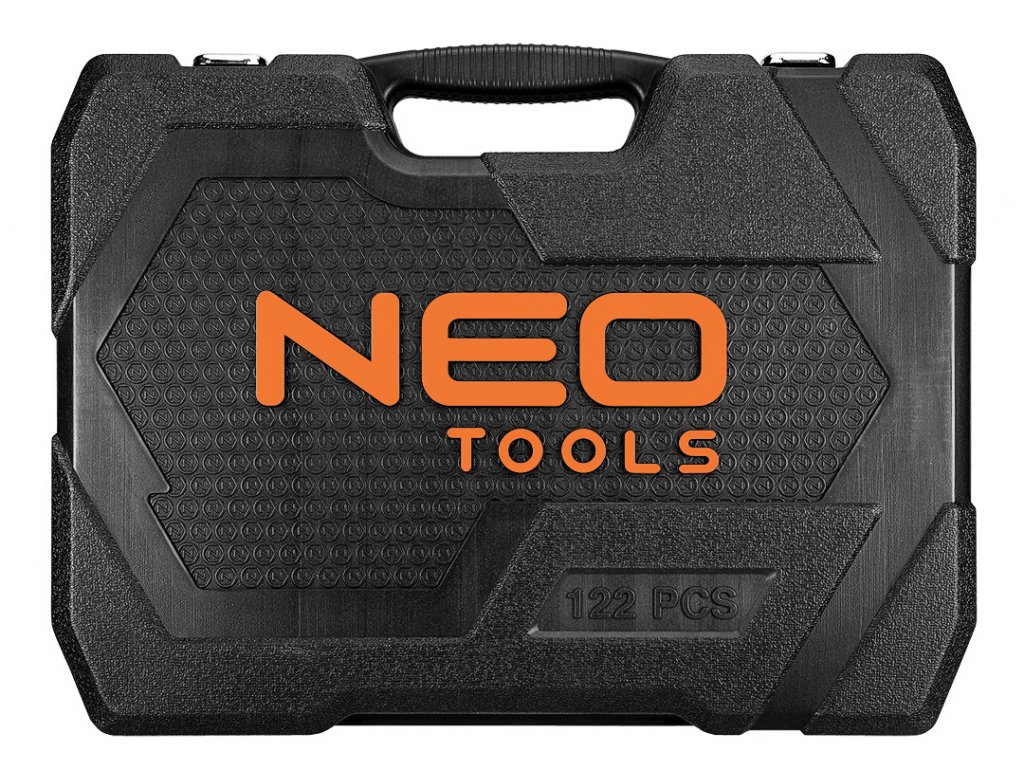 122dílná sada nářadí 10-196 od společnosti NEO je sada nabízená v praktickém kufříku pro uložení a přepravu nářadí. Na výrobek se vztahuje záruka 25 let. Jedná se o vynikající nabídku pro profesionály a kutily - pro domácí i profesionální použití. Sada obsahuje: 1/2" šestihranné hlavice 15 ks: 12, 13, 14, 15, 16, 17, 18, 19, 20, 21, 22, 24, 27, 30, 32 mm, 1/2" dlouhé šestihranné hlavice 6 ks: 10, 12, 13, 14, 17, 19 mm, 1/2" ráčna 72 zubů 255 mm, 1/2" nástavec 1 ks: 250 mm, 1/2" nástrčná hlavice 2 ks: 16 mm a 21 mm, 1/2" univerzální kloub, 1/2" imbusové kolo, 1/2" torxová hlavice 8 ks: 1/4" ráčna 72 zubů 155 mm, 1/4" T-rukojeť, 1/4" adaptér na bity, 1/4" univerzální kloub, 1/4" univerzální kloub, 1/4" prodloužení 1/4" 1 ks. 150 mm, 1/4" šroubovák 150 mm, 1/4" šroubovák s kolíkem 150 mm, 1/4" nástrčné šroubováky 22 ks: 4, 5,5, 6,5 mm plochý, PZ2, PZ3, PH2, PH3, H3, H4, H5, H6, T8, T10, T15, T20, T25, T27, TT10, TT15, TT20, TT25, TT40; očkoploché klíče 12 ks: 8, 9, 10, 11, 12, 13, 14, 15, 16, 17, 18, 19 mm, šroubovák s drážkou 2 ks: 4x100 mm, 6,5x100 mm; křížový šroubovák 2 ks: PH2x150 mm, PH3x150 mm; dlouhé ploché kleště 1 ks: 160 mm; střižné kleště 1 ks: 160 mm; kombinované kleště 1 ks: 1 ks: 180 mm, stavitelné kleště 1 ks: 250 mm, kladivo 300 g, bity 1/4" 10 ks: PH0, PH1, PH2, PZ0, PZ1, PZ2, ploché 3, 4, 5, 6 mm; šestihranné klíče 9 ks: 1,5, 2, 2,5, 3, 4, 5, 6, 8, 10 mm.