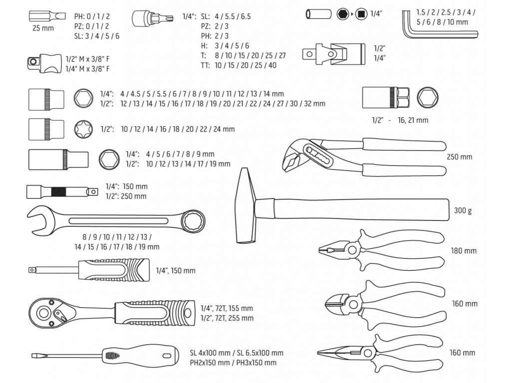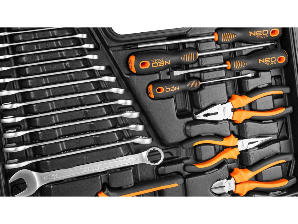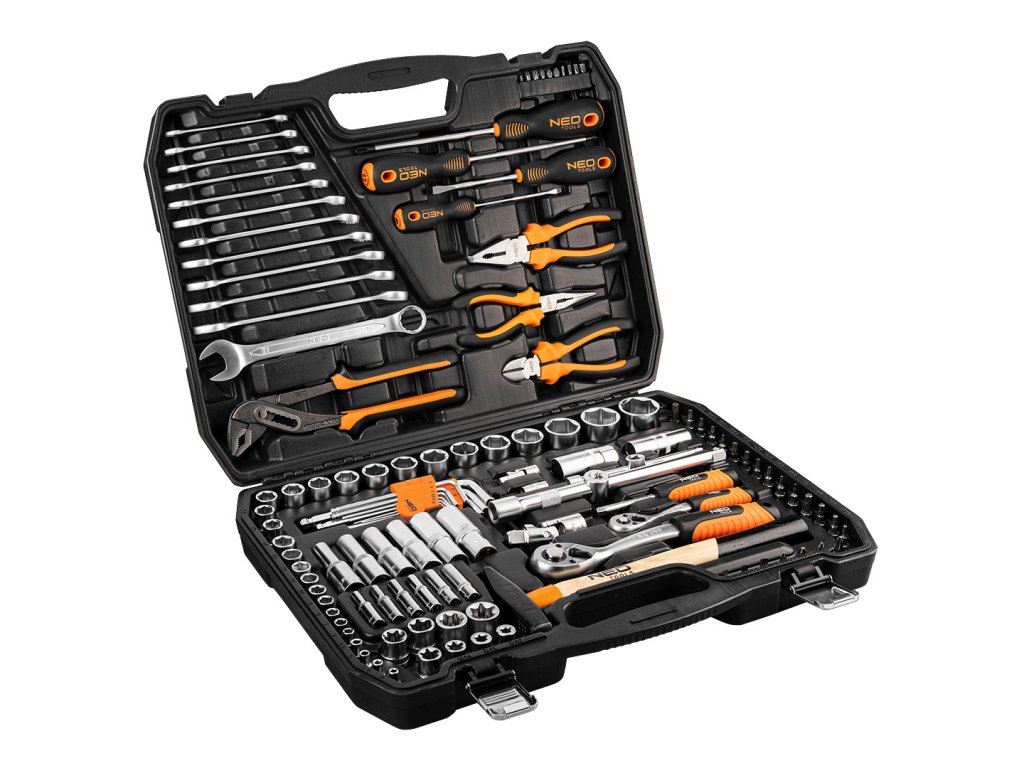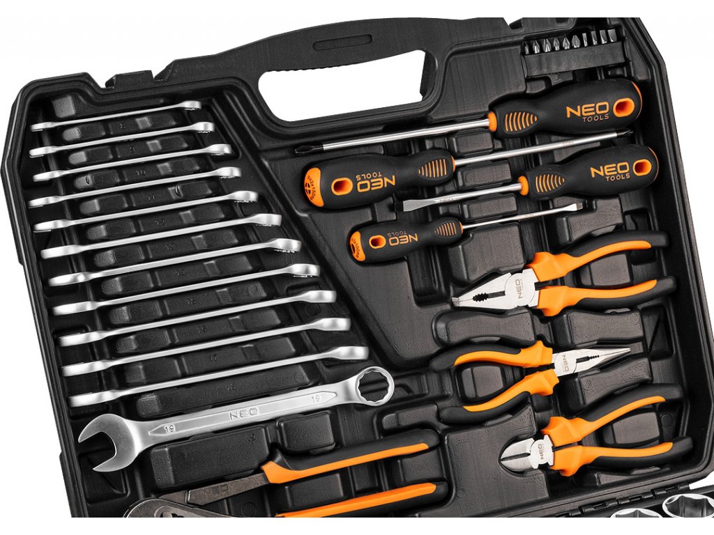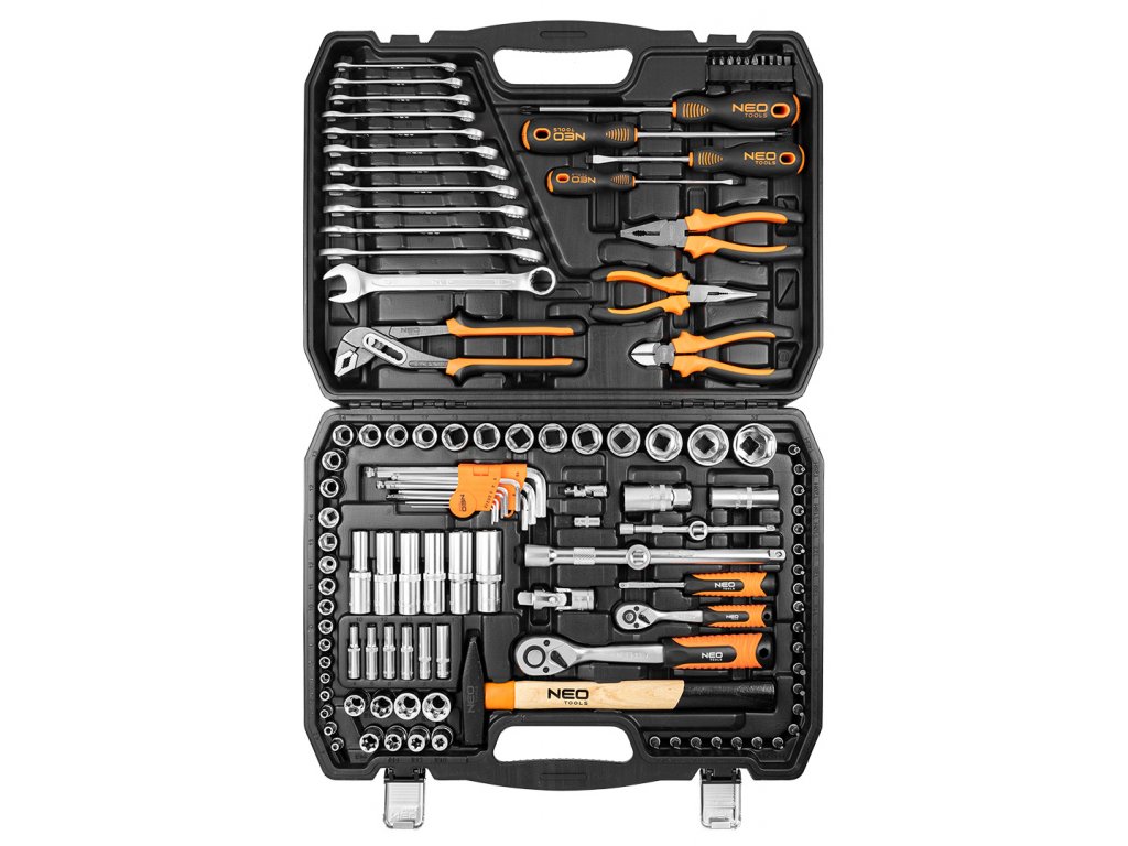 122dílná sada nářadí 10-196 od společnosti NEO je sada nabízená v praktickém kufříku pro uložení a přepravu nářadí. Na výrobek se vztahuje záruka 25 let. Jedná se o vynikající nabídku pro profesionály a kutily - pro domácí i profesionální použití. Sada obsahuje: 1/2" šestihranné hlavice 15 ks: 12, 13, 14, 15, 16, 17, 18, 19, 20, 21, 22, 24, 27, 30, 32 mm, 1/2" dlouhé šestihranné hlavice 6 ks: 10, 12, 13, 14, 17, 19 mm, 1/2" ráčna 72 zubů 255 mm, 1/2" nástavec 1 ks: 250 mm, 1/2" nástrčná hlavice 2 ks: 16 mm a 21 mm, 1/2" univerzální kloub, 1/2" imbusové kolo, 1/2" torxová hlavice 8 ks: 1/4" ráčna 72 zubů 155 mm, 1/4" T-rukojeť, 1/4" adaptér na bity, 1/4" univerzální kloub, 1/4" univerzální kloub, 1/4" prodloužení 1/4" 1 ks. 150 mm, 1/4" šroubovák 150 mm, 1/4" šroubovák s kolíkem 150 mm, 1/4" nástrčné šroubováky 22 ks: 4, 5,5, 6,5 mm plochý, PZ2, PZ3, PH2, PH3, H3, H4, H5, H6, T8, T10, T15, T20, T25, T27, TT10, TT15, TT20, TT25, TT40; očkoploché klíče 12 ks: 8, 9, 10, 11, 12, 13, 14, 15, 16, 17, 18, 19 mm, šroubovák s drážkou 2 ks: 4x100 mm, 6,5x100 mm; křížový šroubovák 2 ks: PH2x150 mm, PH3x150 mm; dlouhé ploché kleště 1 ks: 160 mm; střižné kleště 1 ks: 160 mm; kombinované kleště 1 ks: 1 ks: 180 mm, stavitelné kleště 1 ks: 250 mm, kladivo 300 g, bity 1/4" 10 ks: PH0, PH1, PH2, PZ0, PZ1, PZ2, ploché 3, 4, 5, 6 mm; šestihranné klíče 9 ks: 1,5, 2, 2,5, 3, 4, 5, 6, 8, 10 mm.