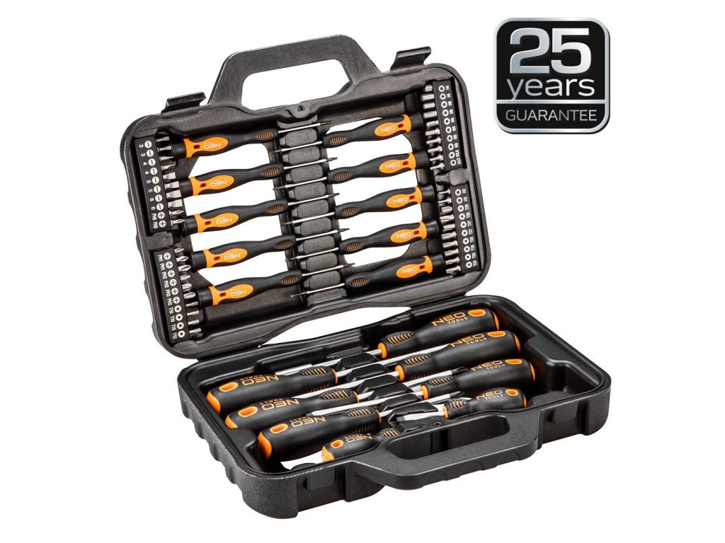 Sada 58ks šroubováků a bitů s praktickým boxem NEO TOOLS. Hrot šroubováku je vyroben z extrémně odolné tepelně upravené oceli S2 o tvrdosti 56HRC a vysoké odolnosti proti ohybu. Šroubovák má magnetický hrot. Trojúhelníkový tvar rukojeti s opěrkou palce snižuje zatížení ruky při práci a usnadňuje dosažení optimálního točivého momentu. Protiskluzová rukojeť složená ze dvou materiálů odolná vůči chemikáliím, olejům a tukům. Vysoká kvalita produktu potvrzená certifikátem TÜV. Na tento produkt se vztahuje záruční doba 25let. Značka NEO splňuje vysoké standardy a splňuje veškerá očekávání profesionálů. Produkt třídy "Profesionální nářadí" Pro řemeslníky i kutily.