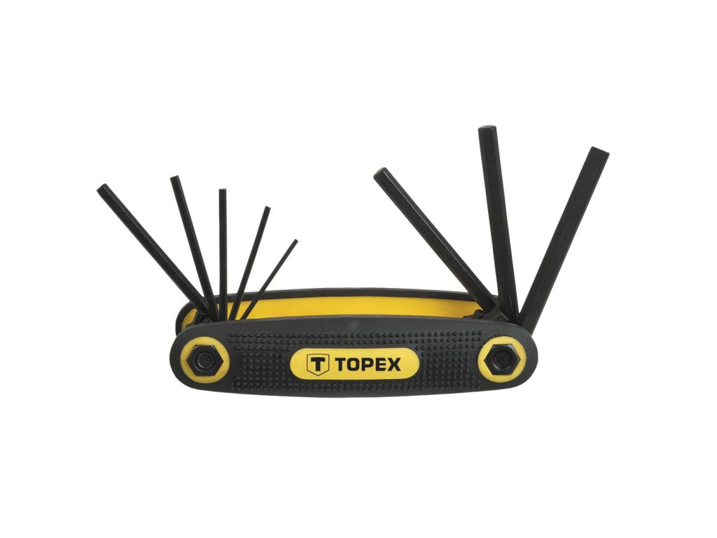 Sada šestihranných klíčů ve rozměrech 1,5 - 6 mm. Vyrobené z odolné CrV (chrom vanadové ocel). Plastová rukojeť, která je navíc pokrytá protiskluzovým materiálem. Klíče jsou složené do rukojeti. Snadné přenášení, třeba i v kapse a snadné skladování. Tato sada tvoří základní vybavení každého kutilského nadšence. Značka TOPEX je zaměřena pro kutily.
