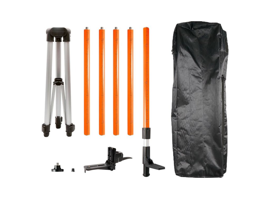 Jasně oranžové části činí stativ dobře viditelným za špatných podmínek. Teleskopický stativ je kompatibilní se všemi typy laserových vodováh a dalšími nástroji (jako jsou dálkoměry).