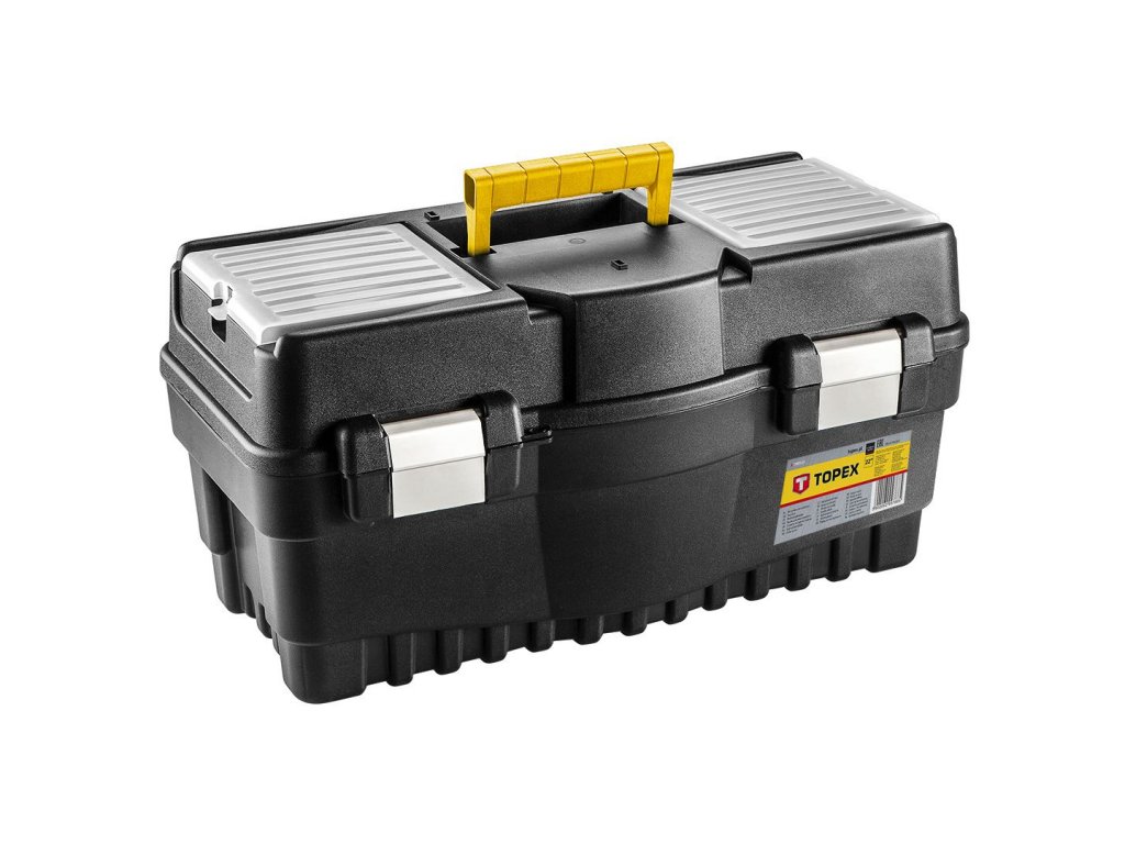 Box na nářadí 22 "TOPEX (č. Ref. 79R133) rozměry 54,7 x 27,1 x 27,8 cm je praktický a robustní kontejner z odolného plastu s hliníkovou svorkou. Box na nářadí má 2 organizéry pro uložení drobností, vnitřní přihrádku a pohodlnou rukojeť pro přenášení Nápomocné jsou také boční rukojeti. Značka TOPEX je zaměřena na kutily.